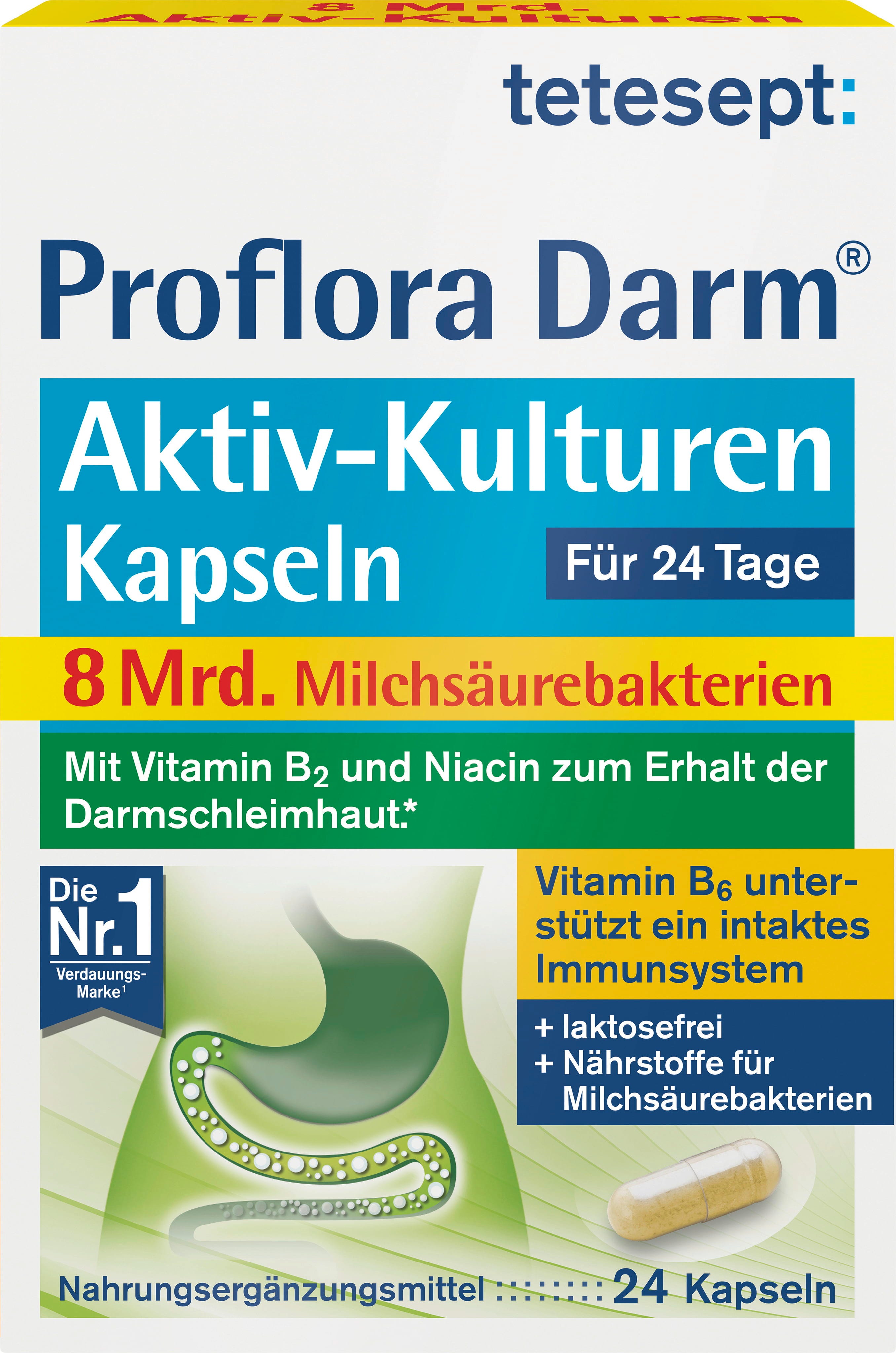 Proflora aktivne crijevne kulture kapsule marke tetesept sadrže 8 milijardi mliječno kiselinskih bakterija iz sojeva Lactobacillus Rhamnosus, Lactobacillus Reuteri i Lactobacillus Plantarum. Dodatno su kapsule obogaćene folnom kiselinom te vitaminima B1, B2 i B6. Kapsule su bez glutena i laktoze.