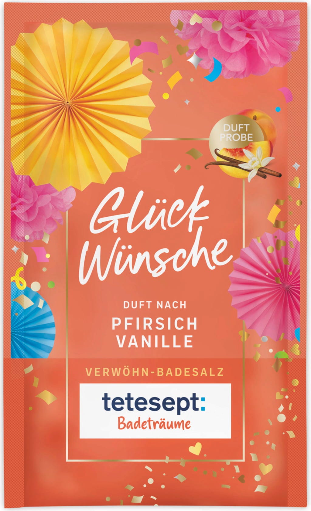 Sol za kupanje Najljepše želje marke tetesept upotpunit će vaš poklon košaru. Darujte svoje najmilije paketom za uživanje - voćno-svjež dodatak kupki pritom naravno ne smije nedostajati. Sol za kupanje širi predivan miris breskve i vanilije i tako trenutak kupanja čini savršenim iskustvom. Formulacija ne sadrži sastojke životinjskog podrijetla i zahvaljujući intenzivnoj formuli za njegu dobro je prikladna za suhu kožu.