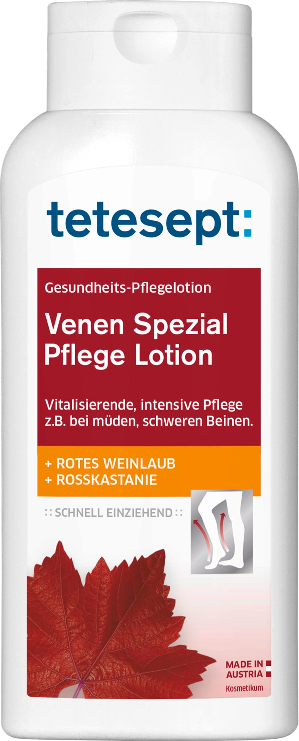 Specijalni losion za njegu vena marke tetesept sadrži eterična ulja kao i dragocjene biljne ekstrakte i predivno je prikladan za sve koji su skloni teškim, umornim nogama. Njegujući losion se brzo upija i oduševljava svojim svestranim svojstvima. Sadržano crveno lišće vinove loze bogato je flavonoidima, dok ekstrakti divljeg kestena sadrže escin i mogu osigurati vitalizirajući učinak. Završetak čini prirodno eterično ulje matičnjaka.