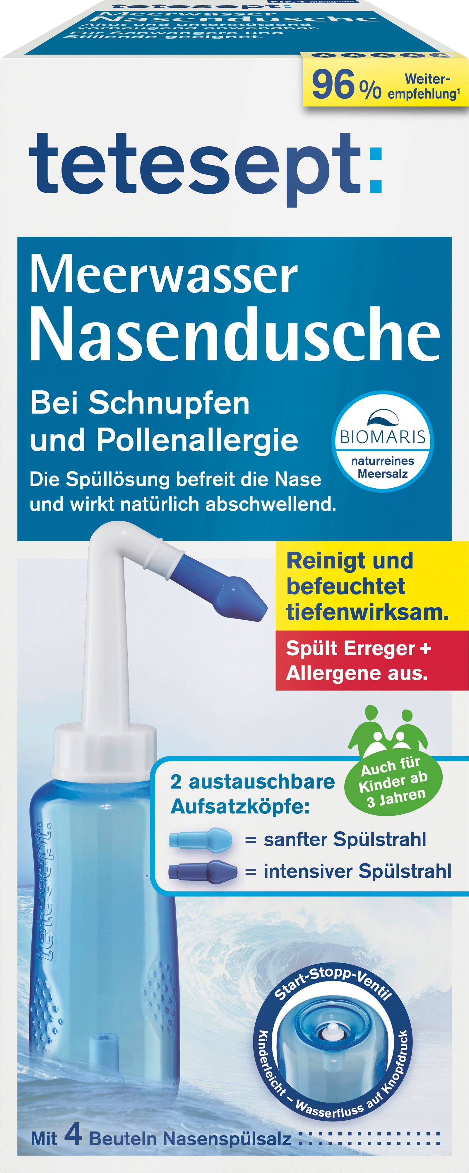 Tuš za nos s morskom vodom marke tetesept namijenjen je za uporabu zajedno s otopinama za ispiranje nosa. Možete birati između 2 nastavka (nježan mlaz za ispiranje ili intenzivan mlaz za ispiranje). Zahvaljujući praktičnom start-stop ventilu, sami određujete kada ispiranje počinje i prestaje. U pakiranju su već sadržane 4 vrećice soli za ispiranje nosa. Pod nadzorom, tuš za nos je prikladan i za djecu od 3 godine.
