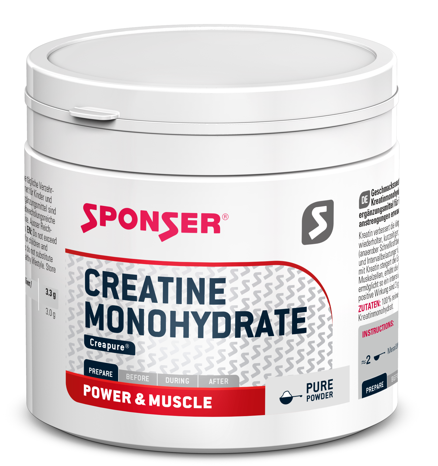 Kreatin u prahu marke Sponser se sastoji 100% od kreatin-monohidrata bez ikakvih dodataka, a također je i veganski. Čisti prah je stoga pogodan za sportove snage i brzine visokog intenziteta, ali se može koristiti i u području izdržljivosti.