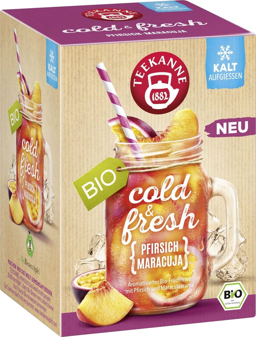 Cold & Fresh Bio breskva-marakuja marke TEEKANNE je voćno-svježa čajna kreacija za hladnu pripremu! Ljupka breskva i egzotična marakuja podsjećaju Vas na sunčane dane godišnjeg odmora, a ugodna slatkoća potječe isključivo od slatkog lišća (stevije) - receptura ne sadrži dodane šećere. Proizvod također ponosno nosi bio certifikat.