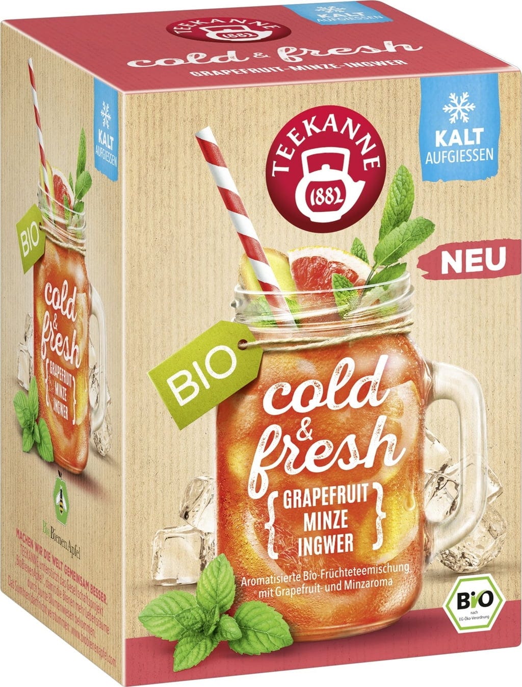 Uvijek može biti cool: uz Cold & Fresh Bio grejp-metvica-đumbir marke TEEKANNE imate poticajnu čajnu kreaciju za pripremu s hladnom vodom u čaši! Trio od grejpa, metvice i đumbira izoštrava sva osjetila - idealno za trenutke koji zahtijevaju kratki predah. Ugodna slatkoća potječe isključivo od slatkog lišća (stevije), a receptura ne sadrži dodane šećere. Proizvod također ponosno nosi bio certifikat.